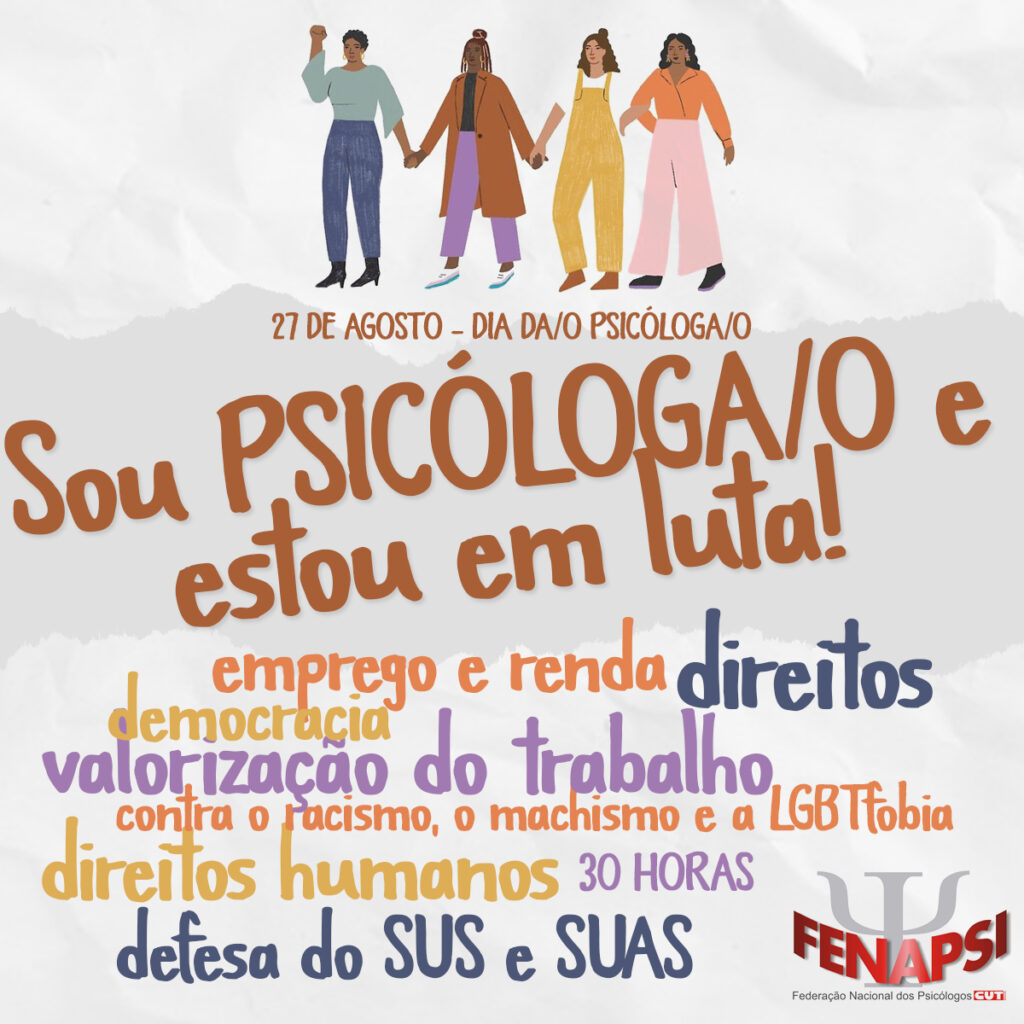 Neste 27 de Agosto a Federação Nacional de Psicólogos – FENAPSI ✊? celebra junto à categoria profissional e faz um convite: venha lutar conosco, em defesa do trabalho e renda, das políticas públicas e contra toda forma de injustiça! ?