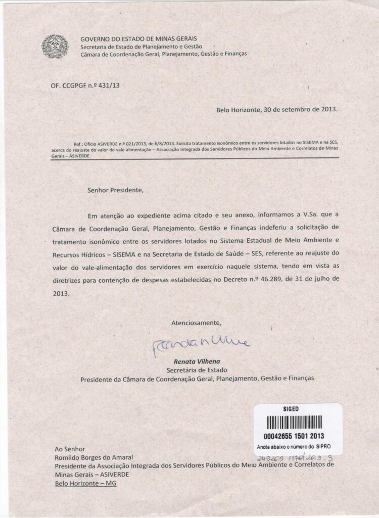 Na defesa das prerrogativas e dos interesses dos seus associados e demais servidores do SISEMA, a ASIVERDE exige que o Vale Alimentação deva ser suficiente para uma alimentação completa. O argumento apresentado no ofício acima é mais fraco que “quentinha” sem carne, uma vez que o nossa solicitação foi enviada em 17 de junho de 2013 e o decreto referido no ofício da Secretária é de 31 de julho de 2013.