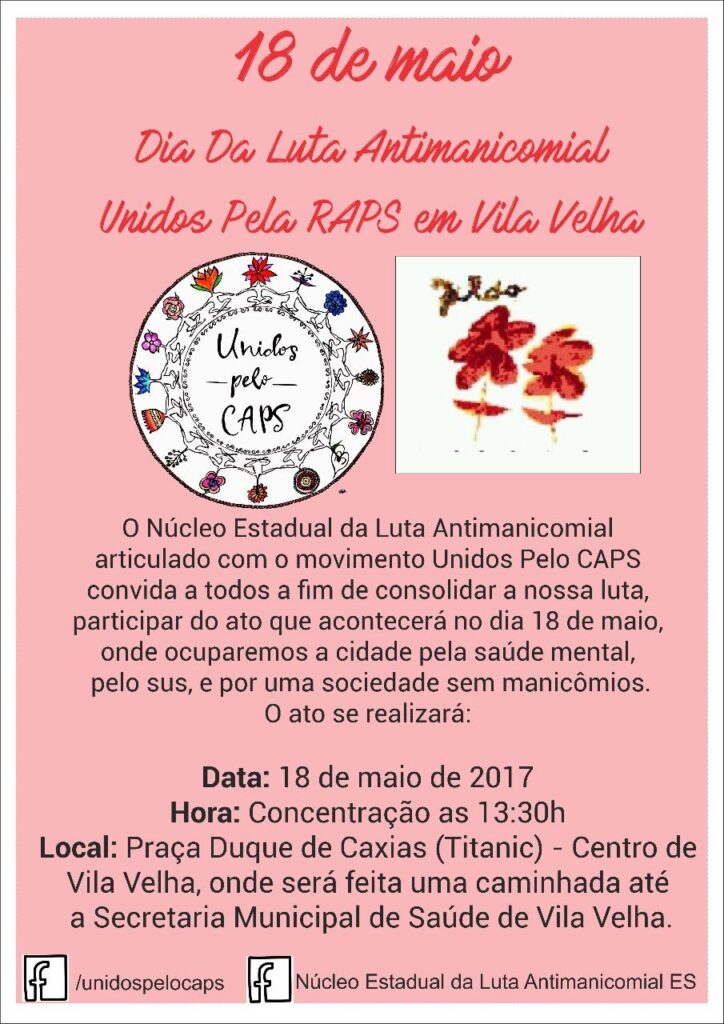 Nascia ali o Dia Nacional da Luta Antimanicomial, lembrado neste 18 de maio (quinta-feira), com diversas ações em todo o País, visando o fortalecimento da Rede de Atenção Psicossocial (Raps), a garantia dos direitos das/os usuários da política de Saúde Mental e reafirmando a extrema necessidade de uma vida, de uma sociedade sem manicômios.