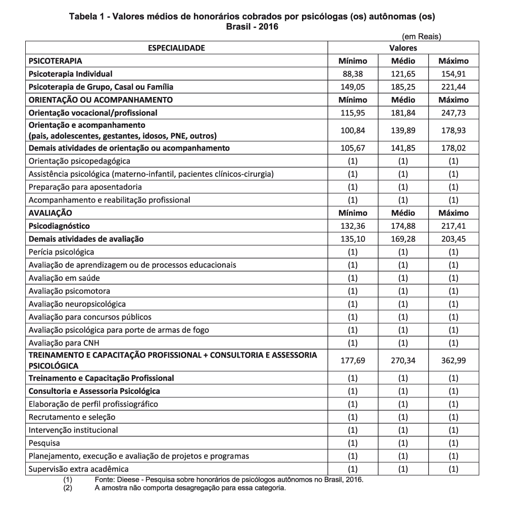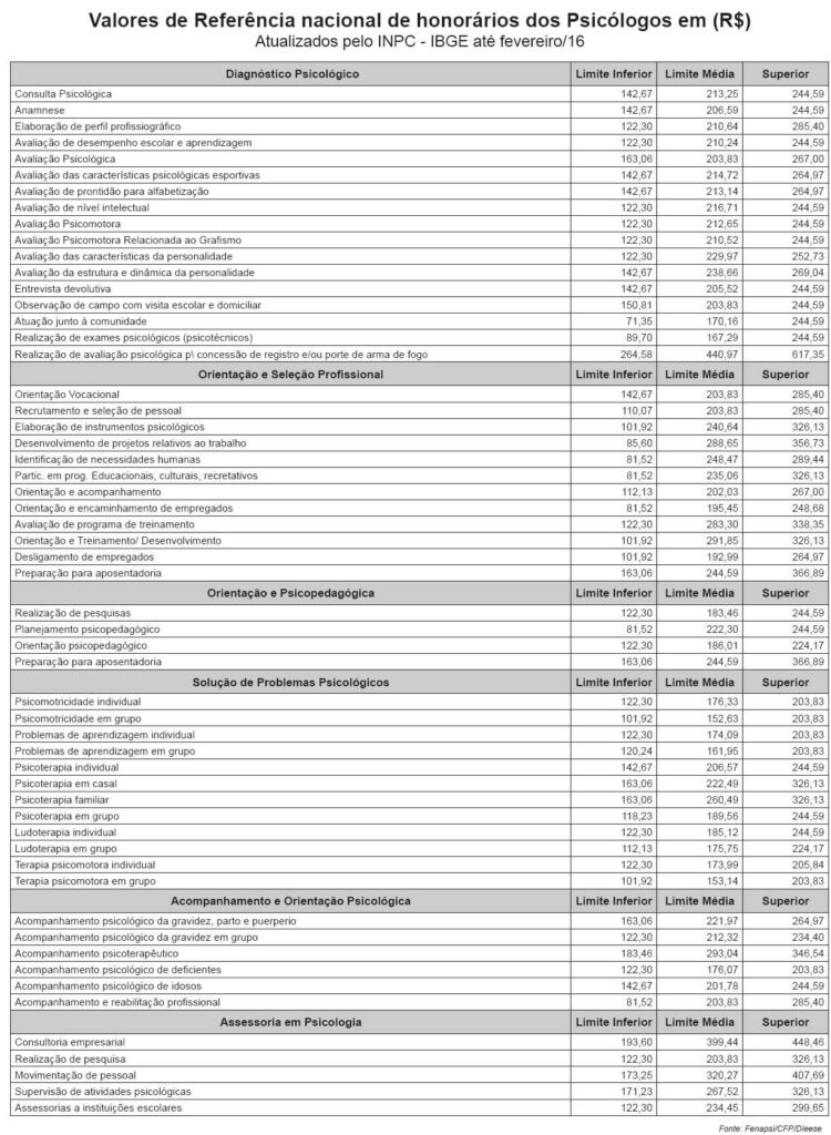 O Conselho Federal de Psicologia (CFP) e a Federação Nacional dos Psicólogos (Fenapsi) divulgam duas tabelas de referência para atualização dos valores dos honorários relativos aos serviços prestados pelas (os) psicólogas (os) autônomas (os). Ambas foram elaboradas pelo Departamento Intersindical de Estatística e Estudos Socioeconômicos (Dieese), a partir de metodologias diferentes: média dos honorários praticados em 2016; e atualização monetária pelo INPC-IBGE entre 2003 e 2016.
