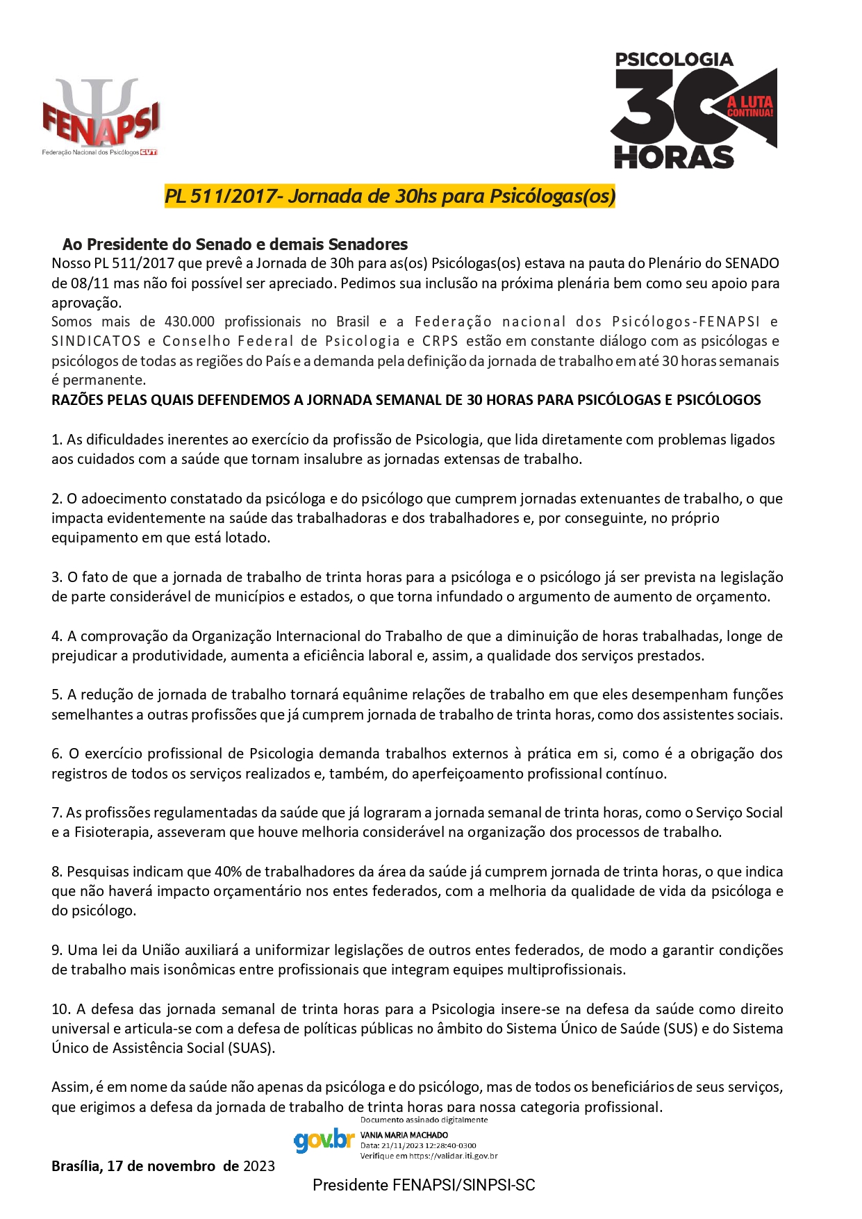 pela aprovação do PL 511/2017, um dos Pls da JORNADA DE 30H que estará na pauta da 49ª Reunião da Comissão de Assuntos Econômicos – CAE do SENADO.
