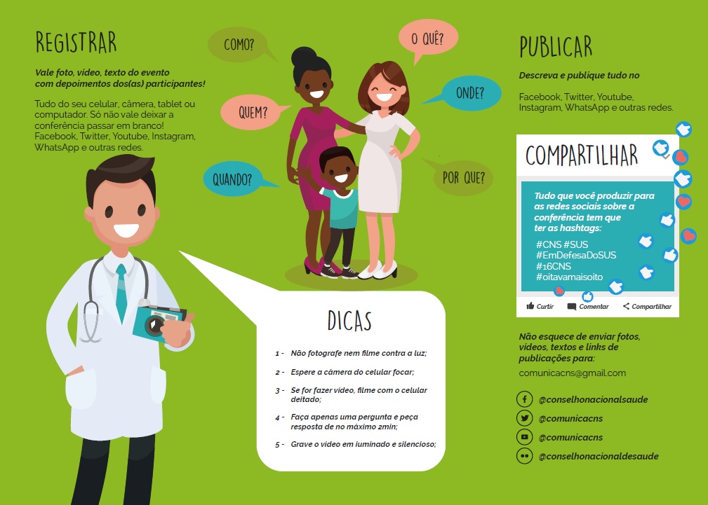 O Conselho Nacional de Saúde (CNS) realizará entre os dias 4 e 7 de agosto a 16ª Conferência Nacional de Saúde (8ª + 8). Que tal ajudar a população a entender mais sobre o assunto e divulgar as etapas municipais, estaduais, livres, distrital e nacional?